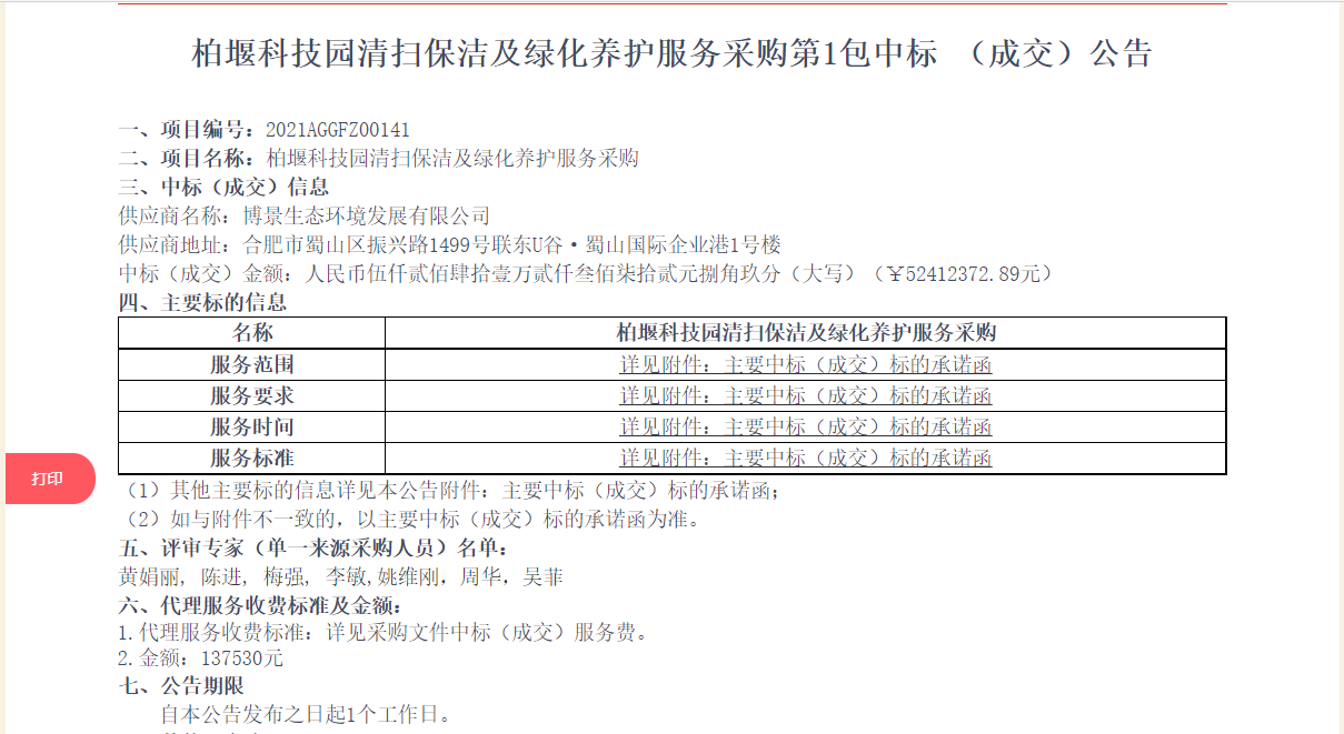 安徽合肥公共資源交易中心消息,8月11日新一輪柏堰科技園清掃保潔及綠化養護服務采購項目開標,成交價101798332.9元,比上輪次增加30527305.9元(該項目上輪次政府采購于2018年1月份開標,成交價71271027元)。項目采購需求表明,柏堰科技園清掃保潔及綠化養護服務采購項目服務內容包括清掃保潔、綠化養護、柏堰湖水面管護、攤群點管理等四方面,服務期限3年。中標結果如下: