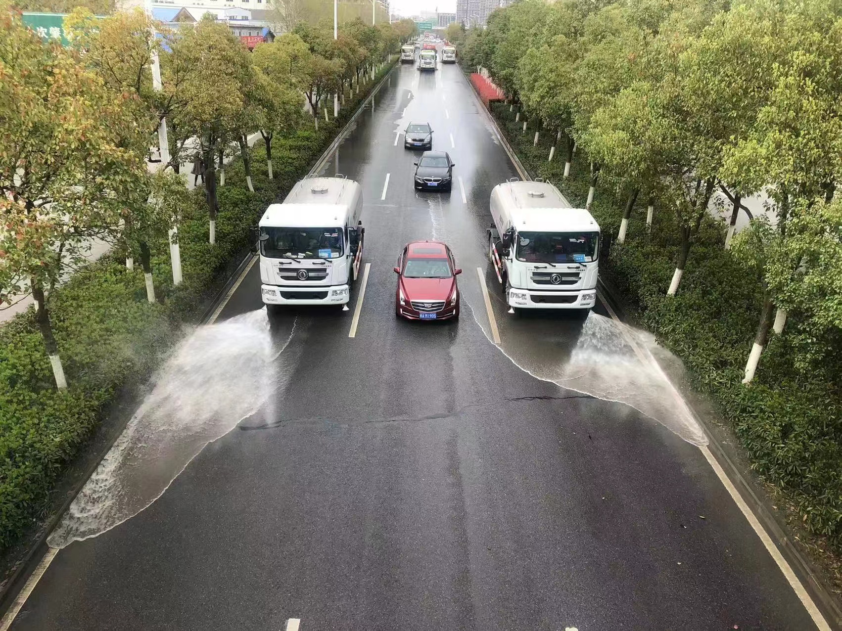 灑水作業覆蓋城區主要街道,采用“機械灑水—洗掃—人工沖刷”相結合的路面清洗模式減少道路揚塵污染,提升道路日常清掃保潔質量。