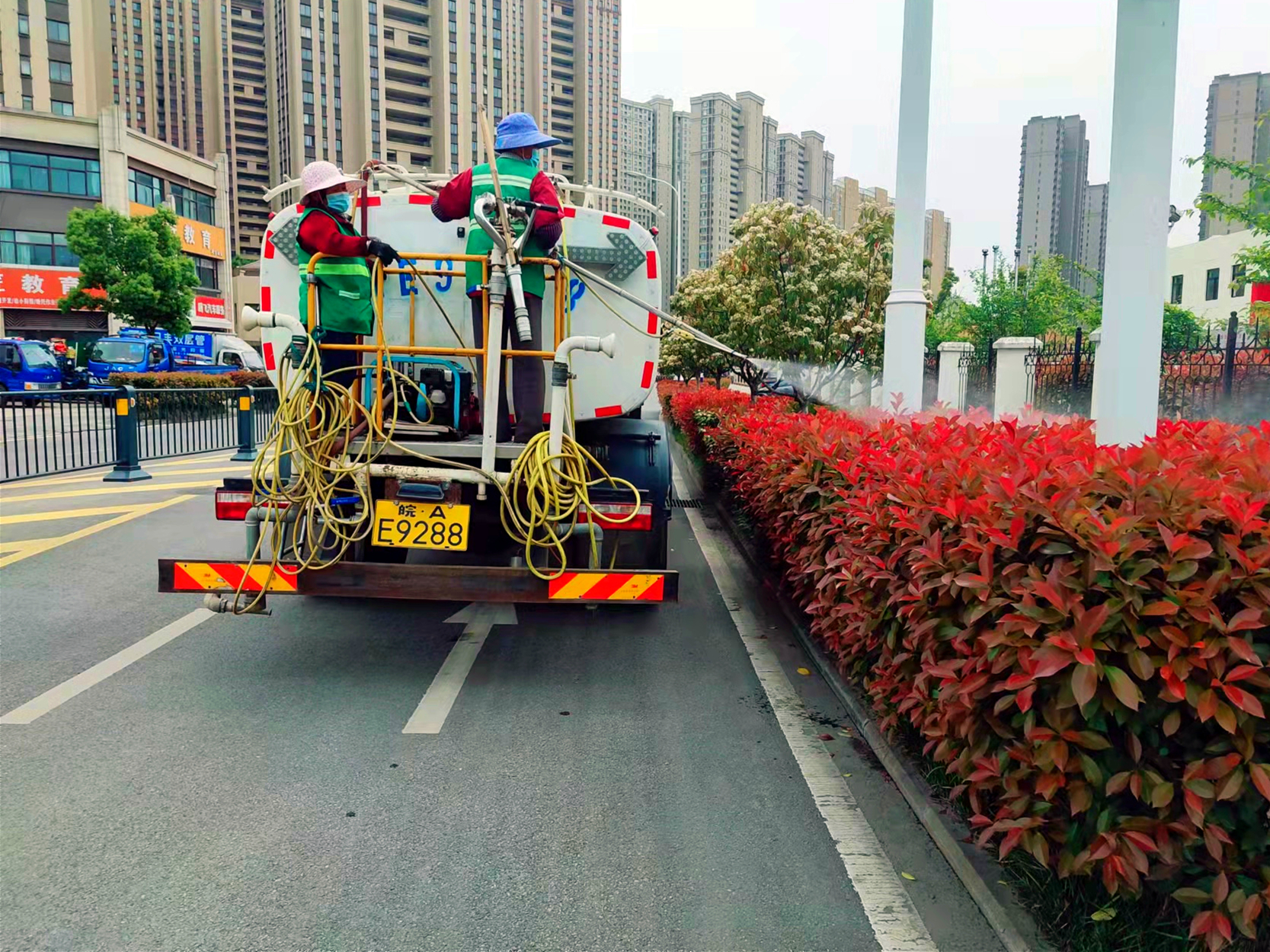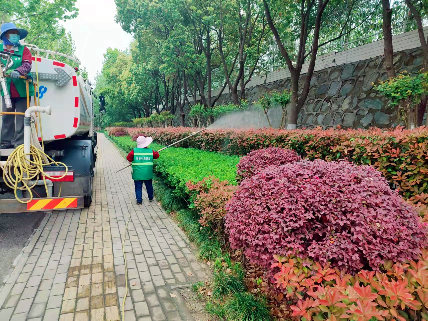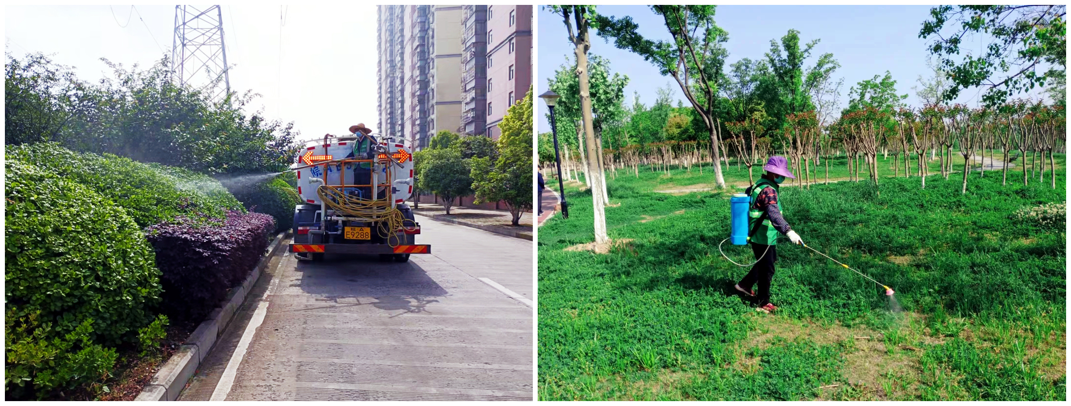 為遏制林木花卉蟲害的滋生和蔓延,保護(hù)道路綠植健康成長(zhǎng),我司各項(xiàng)目沿線行道樹和花卉開展病蟲害防治工作,出動(dòng)灑水車及工作人員,做好防護(hù)措施,對(duì)公園和道路進(jìn)行病蟲害防治工作。
