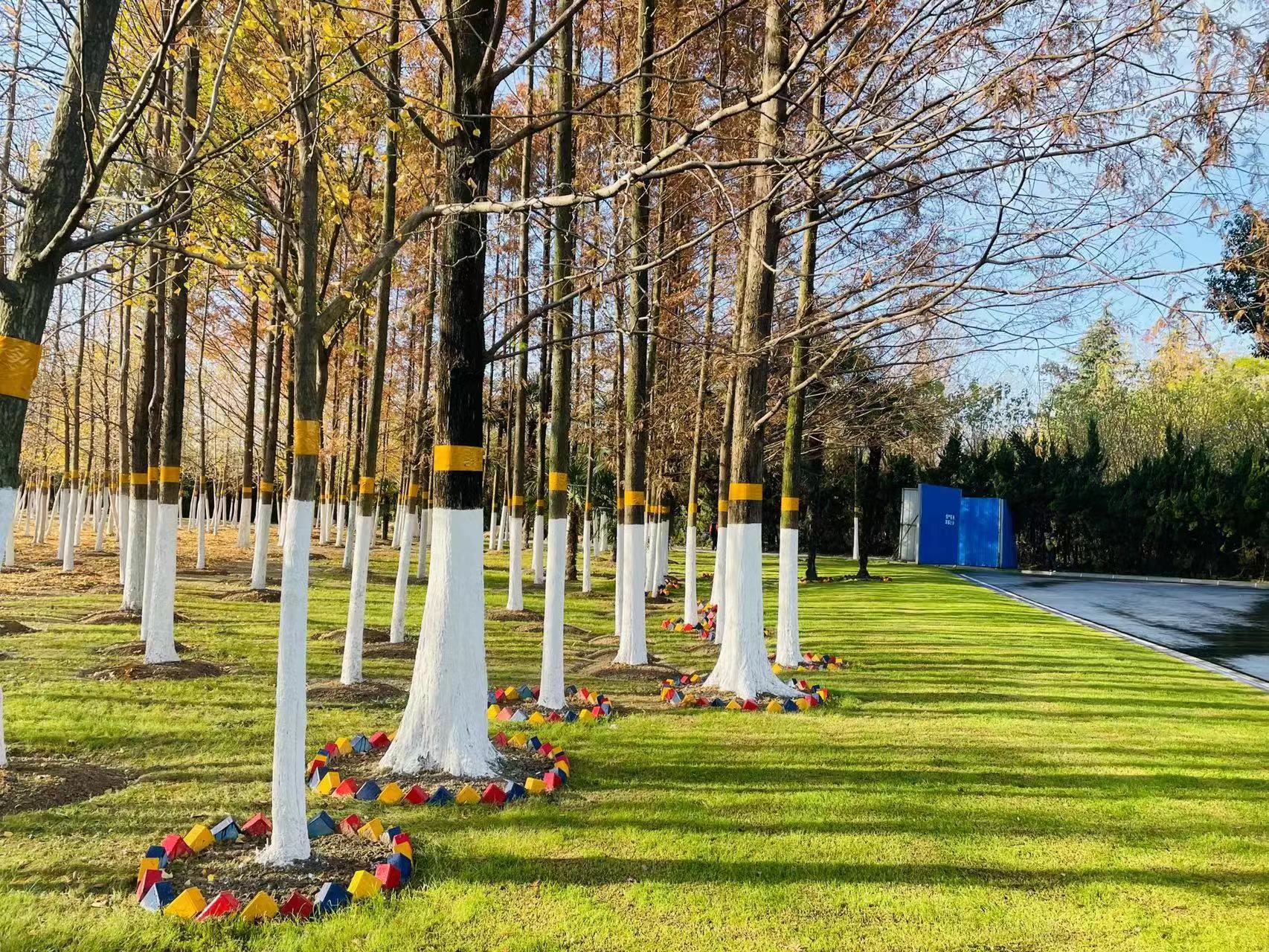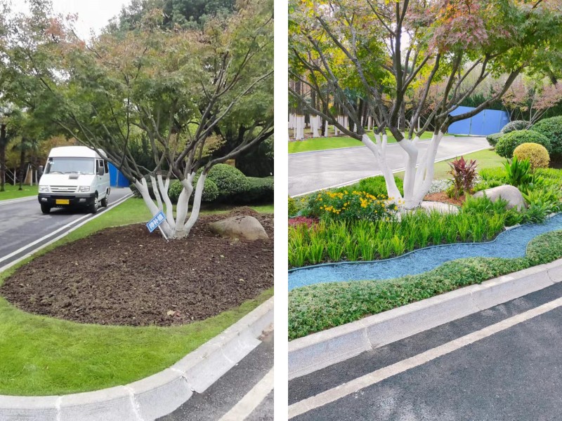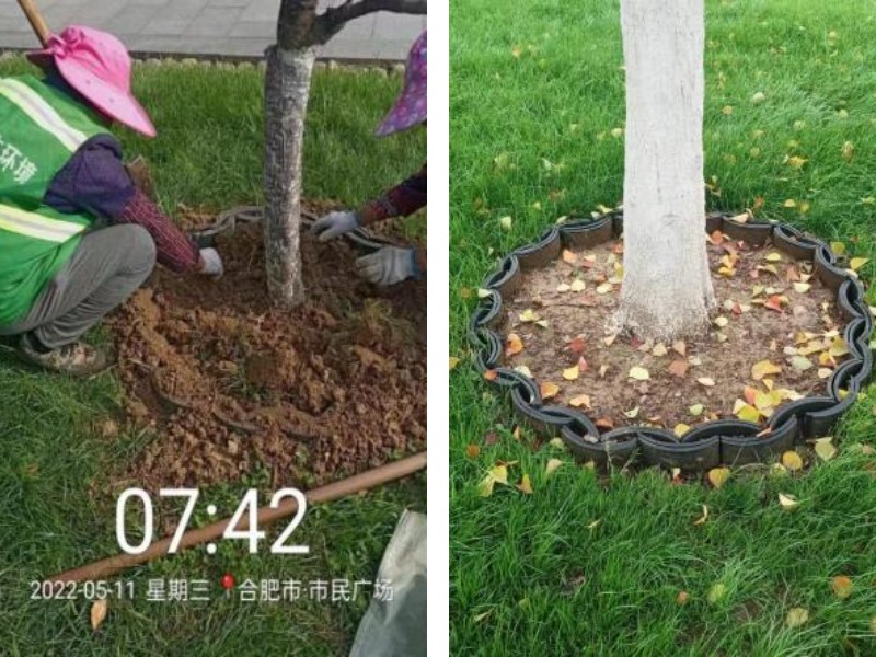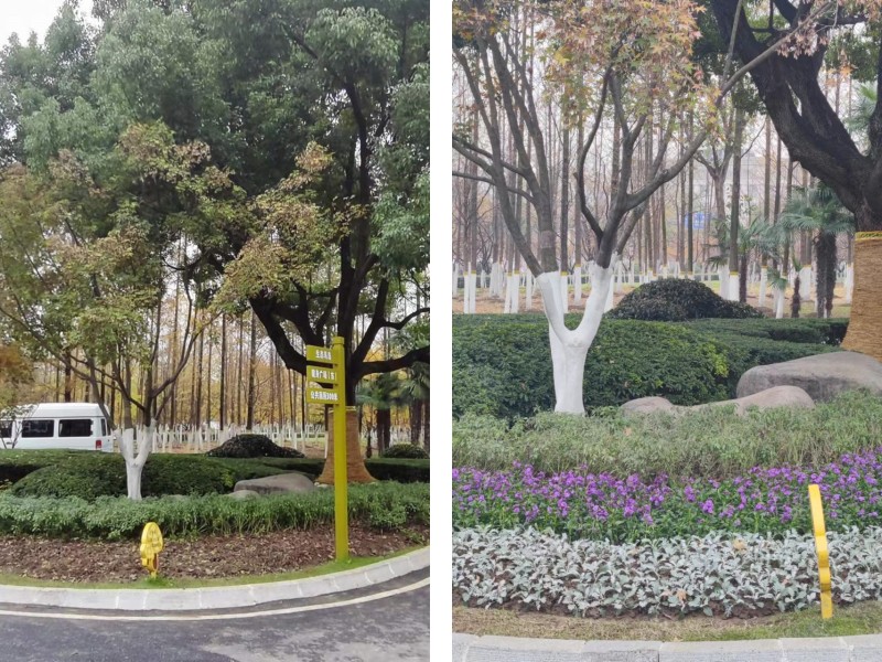 生態公園創新式采用有機物覆蓋樹盤,使用有機物覆蓋可以更有效的減少雜草的生長,可以防止土壤表面壓實,促進土壤吸水入滲,使土壤里的水分更好的維持。