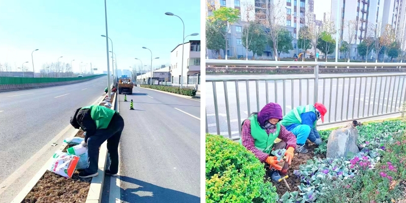 其中綠化養護方面,當前階段重難點主要放在復壯施肥和還綠補植上。針對范圍內缺株、黃土裸露問題進行面積統計,針對不同路段制定補植方案和計劃,陸續安排人員對缺株位置進行補植。其次面對存在植株稀疏、枯黃、長勢衰弱的路段進行備案統計,制定施肥計劃,并按照按計劃施肥,以保證苗木長勢及補植苗木的存活率。
